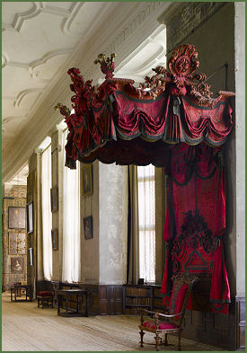 The hall contains a fine collection of fine tapestry, furniture and paintings dating from the sixteenth and seventeenth centuries. There is also a large collection of embroideries, mostly dating from the late sixteenth century. Some of the needlework which is displayed at Hardwick bears Bess' monogram "ES" (Elizabeth Shewsbury), and is reputed to have been worked by Bess of Hardwick herself. A bed claimed to be that of Mary, Queen of Scots, bears her arms as Queen of Scotland and Dowager of France over the door, and her initials worked into the tapestry.