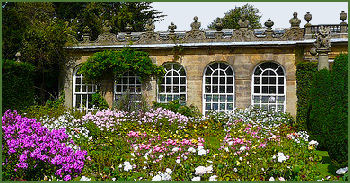 The Display Greenhouse was built in 1970 in a modern style. It has three climate zones, tropical, Mediterranean and temperate. Public access is limited but groups may book tours. The Kitchen Garden is a fruit and vegetable garden with decorative features. It was created behind the stables in the early 1990s.