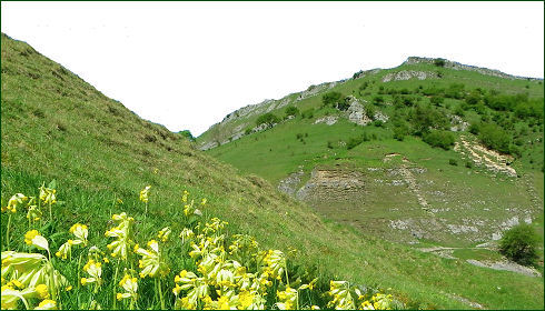 Many colourful wild flowers can be found throughout the dale in the springtime. The attractive pure white flowers of lesser stitchwort, lords-and-ladies, one of our most unusual and conspicuous woodland plants, yellow cowslips, wild garlic, lesser celandine, jacobs ladder, bloody cranesbill, the colourful blue flowers of wood forget-me-not, lily-of-the-valley, water avens, wood anemone, the bright blue flowers of speedwell, wood sedge, cuckoo flower, broad-leaved helleborine, rockrose, dog violets, bird's foot trefoil and many more.