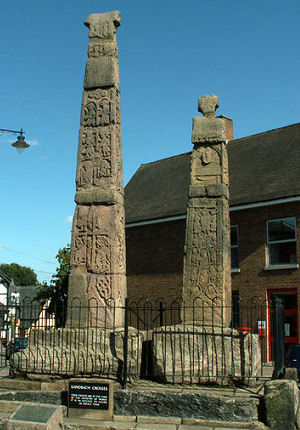 The historic Sandbach Saxon crosses, which are scheduled ancient monuments, are said to date from the seventh, eighth or ninth centuries. A plaque located on the crosses states they were completed in the ninth century, It reads as follows:-