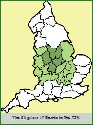 Mercia was settled by Angles in around 500A.D. The kingdom at first consisted of the border areas (modern Staffordshire, Derbyshire, Nottinghamshire, and northern West Midlands and Warwickshire) that lay between the districts of Anglo-Saxon settlement and the Celts or Wealas (meaning foreigners) , as the Welsh were known to the Anglo-Saxons, It later covered the Hwicce territory (the rest of West Midlands and Warwickshire, eastern Hereford and Worcester, and Gloucestershire) and spread also into what was later Cheshire, Salop, and western Hereford and Worcester.