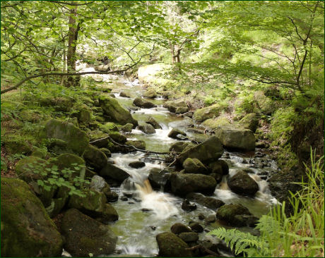 A tumbling stream, known as the Burbage Brook, flows through the gorge, which once formed the boundary between Derbyshire and Yorkshire. Burbage Brook begins its life high up on the purple heather moors above Sheffield.